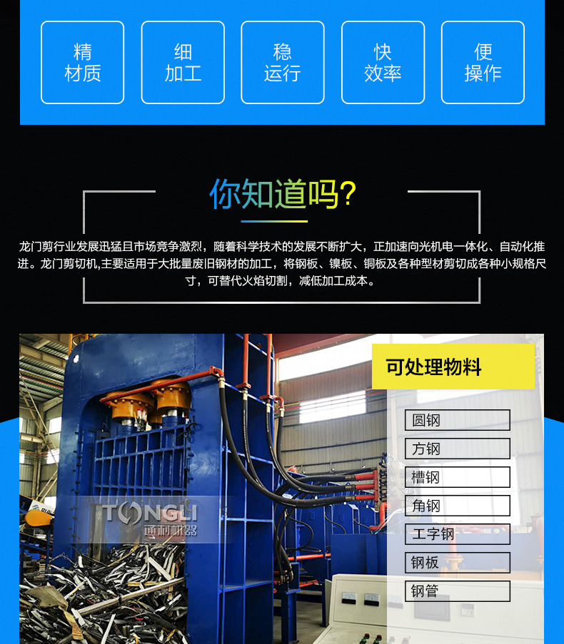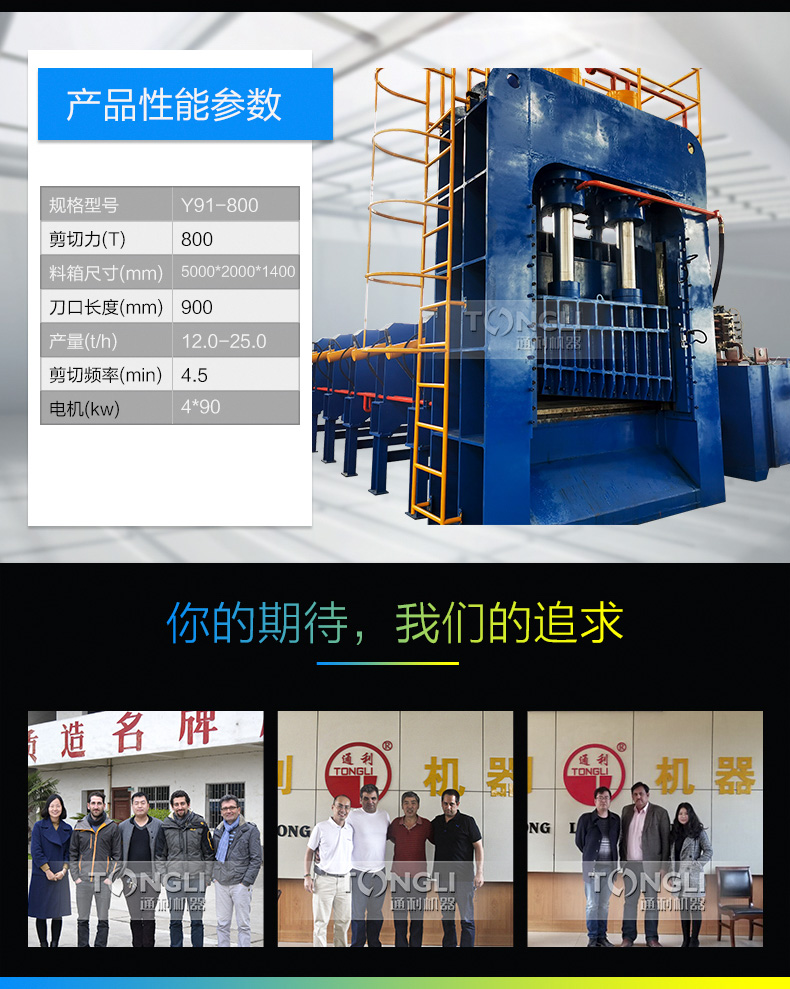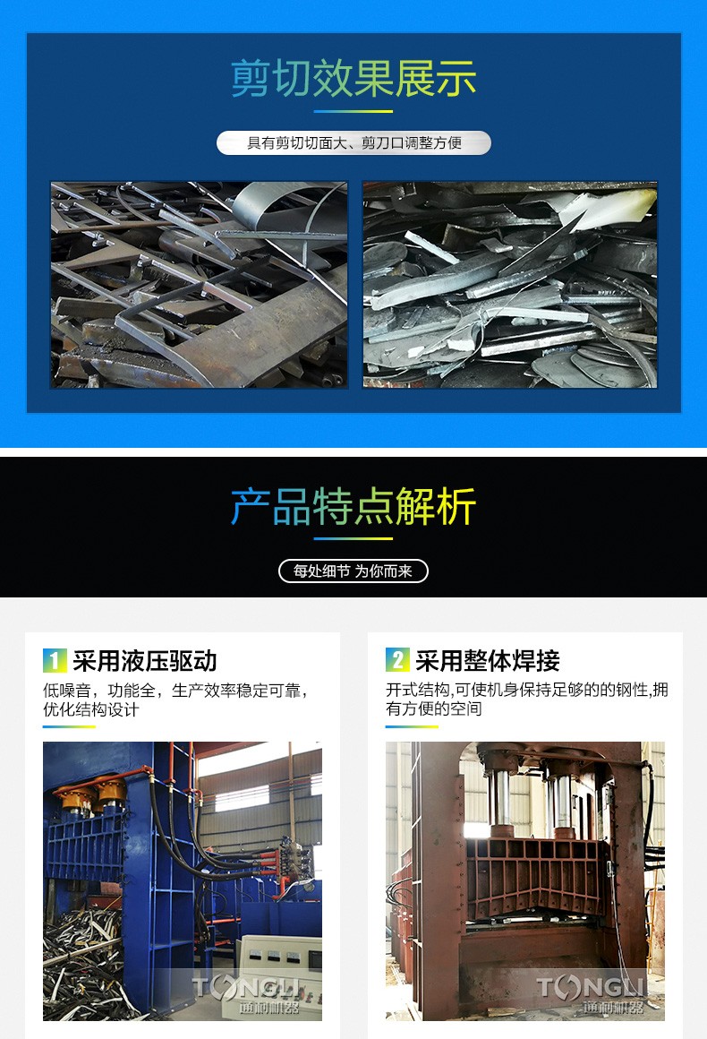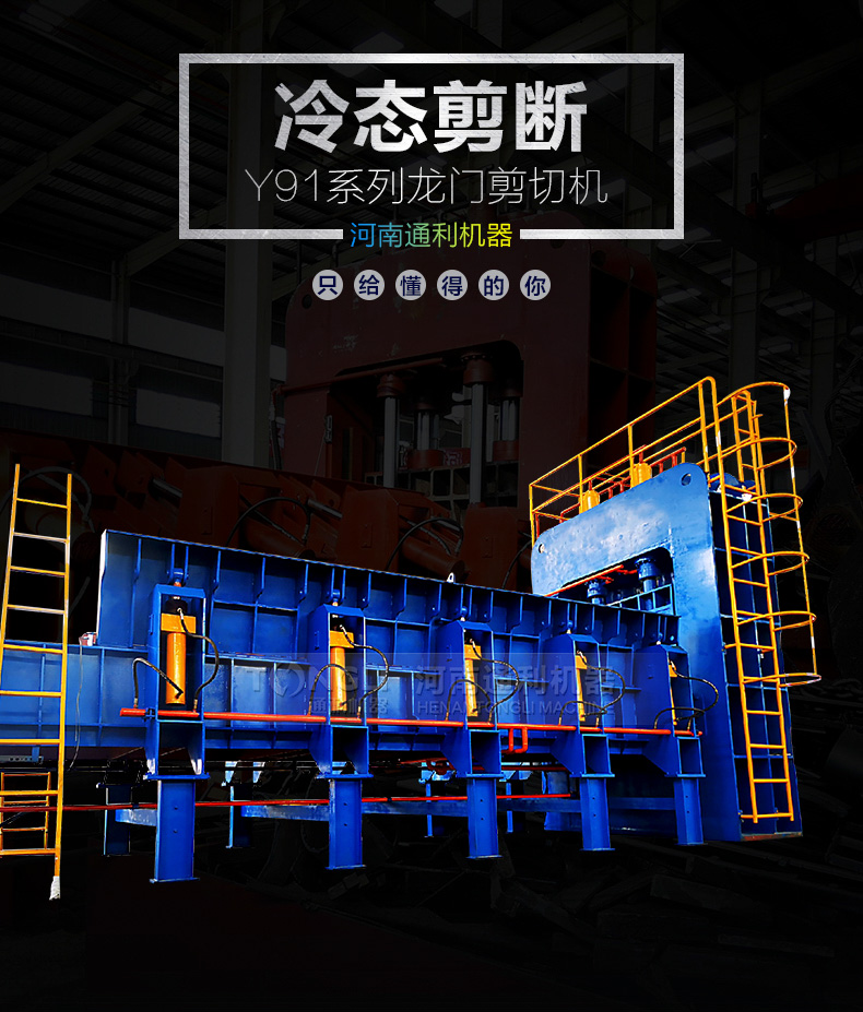 龙门式液压剪切机适用于金属回收加工厂、报废汽车拆解场、冶炼铸造行业,对各种金属进行冷态剪断,加工成合格炉料。河南通利龙门式剪切机,剪切力800吨至1250吨。剪切次数每分钟4~5次。该系列需简单基础设施。采用液压驱动,与机械传动式剪切机相比具有体积小、重量轻、运动惯性小、噪音低、运作平稳、操作灵活、剪切断面等特点。液电一体化控制、可实行单次、连续动作转换、使用简单方便、可在任意工作位置停止、运行、易于实现过载保护。适用范围广泛,既可作金属回收加工单位的加工设备,又可作为工厂铸造车间的炉料加工和机械建筑行业的金属剪断加工设备。