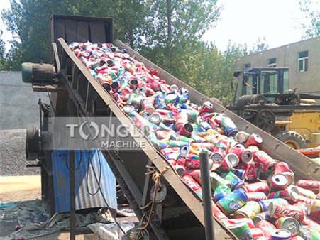 这款产品为一种捶打式破碎设备,可以将各种进入到料仓内的废旧金属桶体破碎加工,在处理效果上油漆桶粉碎机可将各类废弃物料进行破碎揉团加工,整个油漆桶进入主机后在机腔内收到锤头及刀片的相互作用实现对油漆桶的击打、撕扯破碎,经过加工后的金属颗粒在底部筛网网孔中落出到出料机上实现排料,途径磁区域进行铝铁分离,从而得到干净颗粒小均匀的金属料。