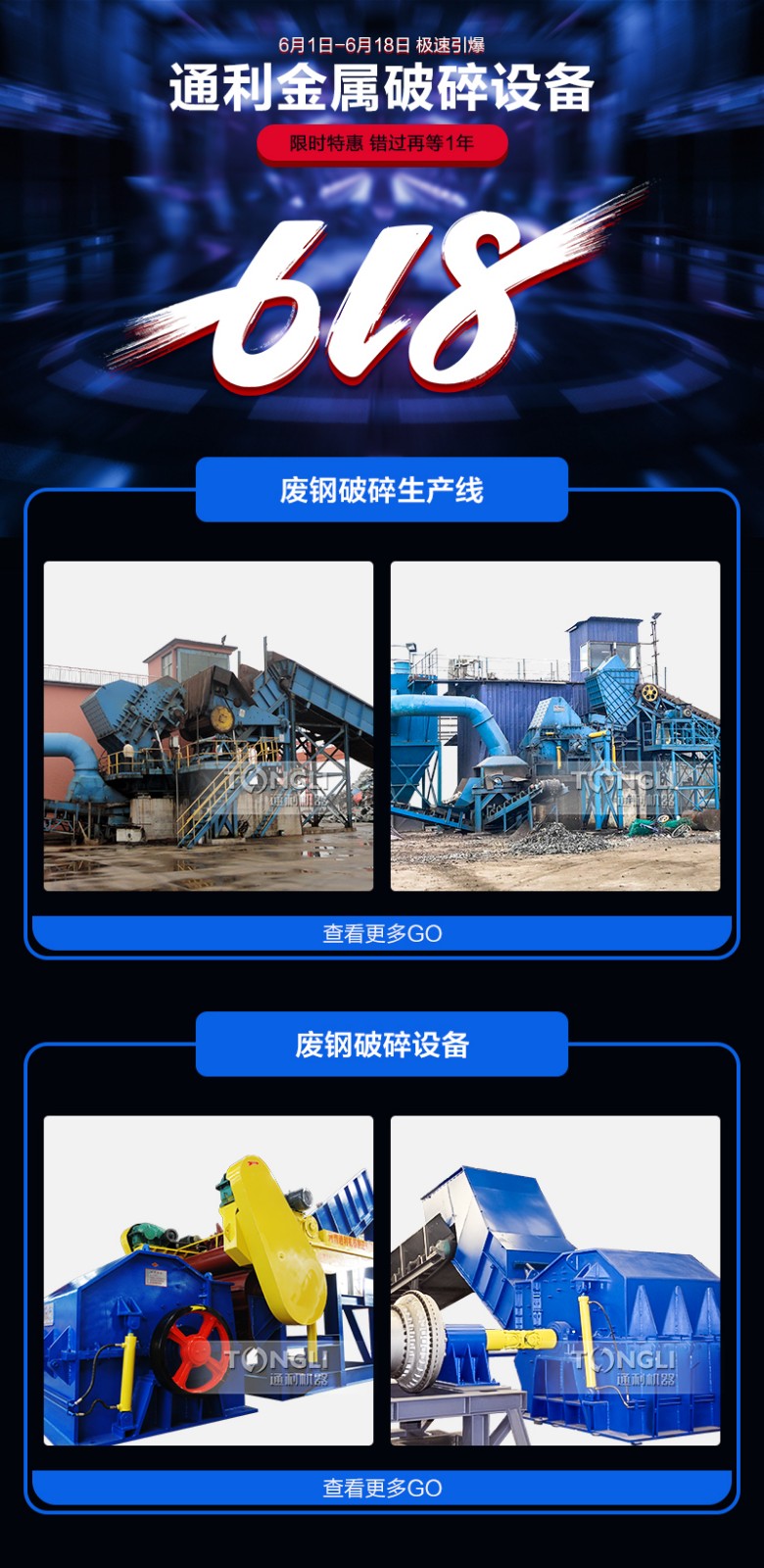 喜迎“6·18”通利金属破碎机设备面促销进行中,有需要的客户请直接联系我们,为您提供适合您厂区使用的设备的资料和报价,方便您在线对比挑,我厂提供试机服务,欢迎广客户朋友前来厂区试机考察。