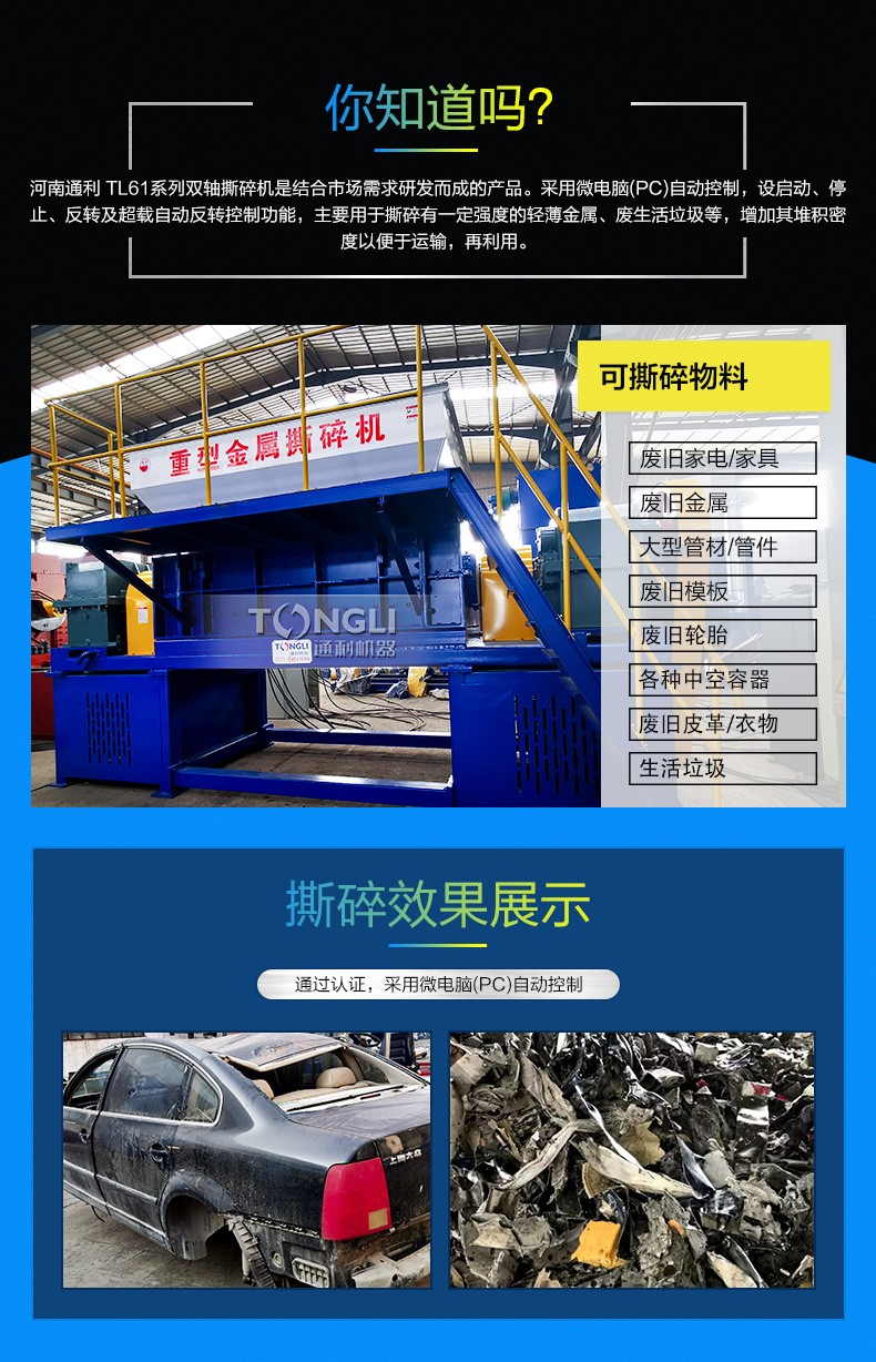 河南通利生产的汽车外壳撕碎机本机采用微电脑(PC)自动控制,设启动、停止、反转及载自动反转控制功能,具有低速、转矩、低噪音等特点。适合撕碎较厚难碎的物料如:电脑硬盘、废旧金属、家电产品、汽车水箱等。