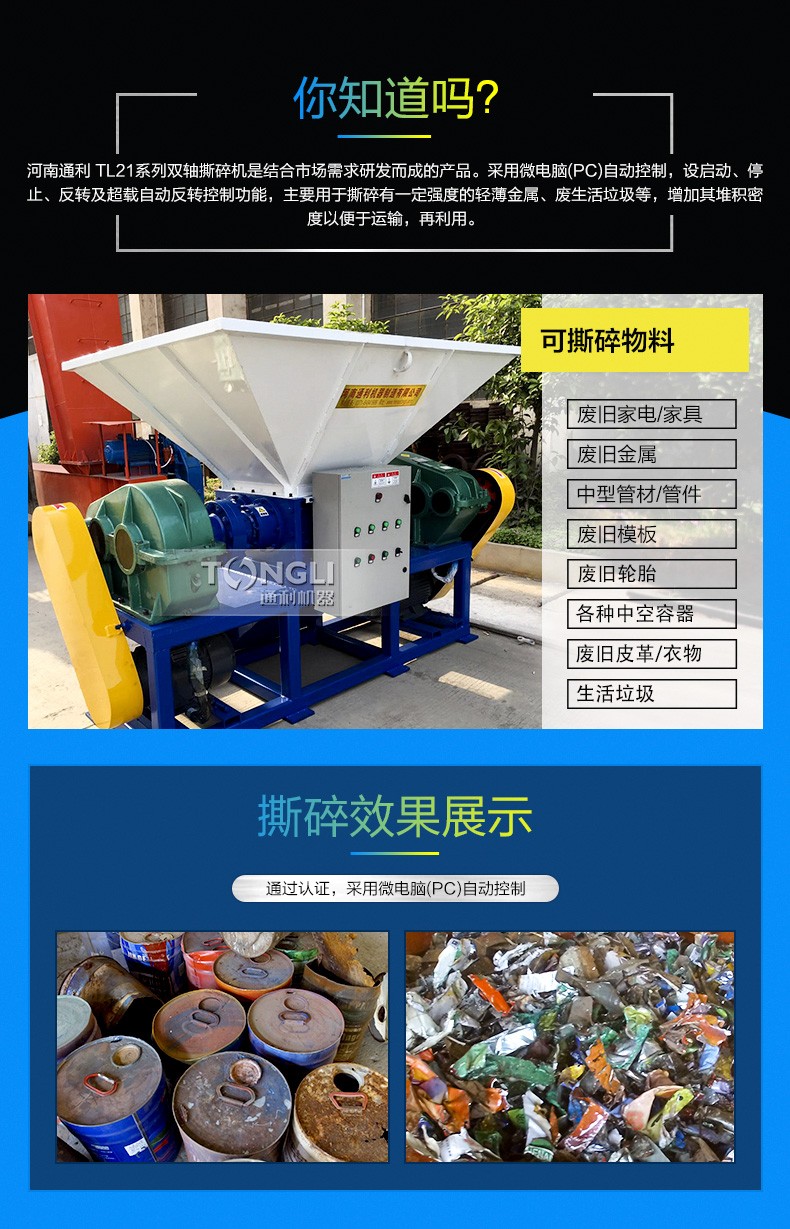 双轴撕碎机又名剪切式撕碎机,通过剪切、撕裂和挤压达到减小物料尺寸、刀具的厚度和刀爪数量可根据不同物料换。撕碎中空物料时可配备压料装置提产量。另可添加旋转筛网控制出料尺寸。低转速运行,噪音和粉尘可达到较的标准。通利撕碎机经过多年研究与实践,并根据实际情况进行改进,推出技术成熟和设计的金属撕碎机系列,为的废物回收利用前期的破碎,减容处理提供质量可靠的设备。