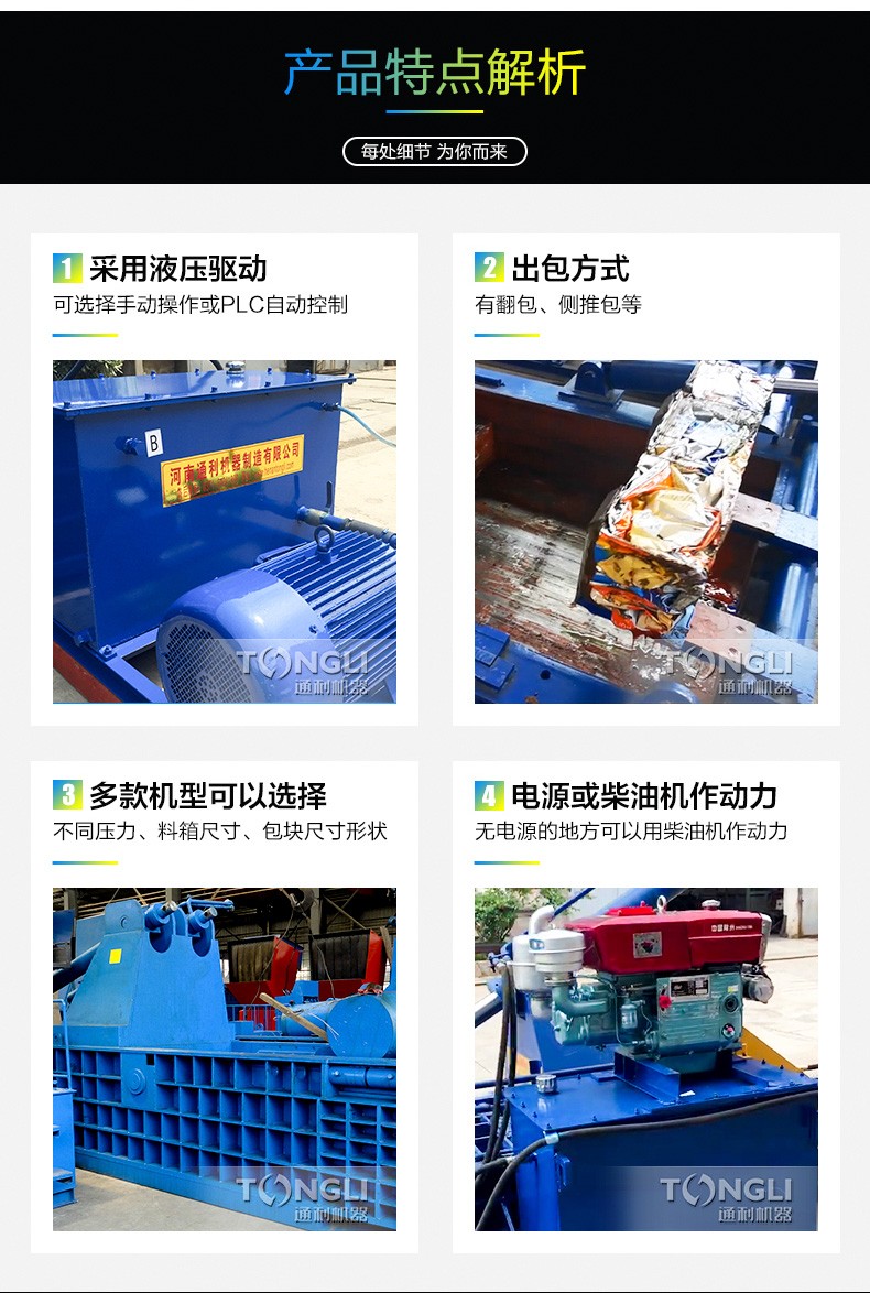 金属打包机主要应用于回收加工行业及金属冶炼行业。可将各种金属边角料、钢刨花屑、废钢、废铁、废铜、废铝、铝刨花屑、解体汽车壳、废油桶等金属原料挤压成长方体。便于储藏、运输及回炉再利用。